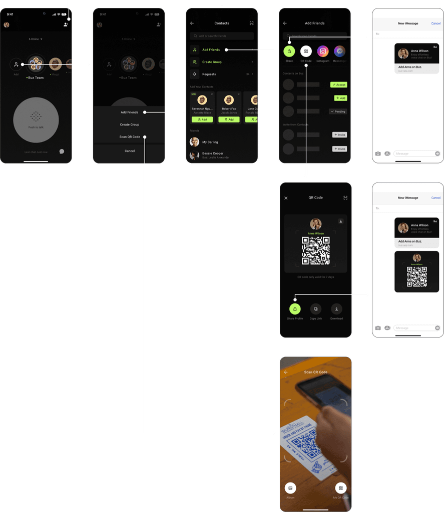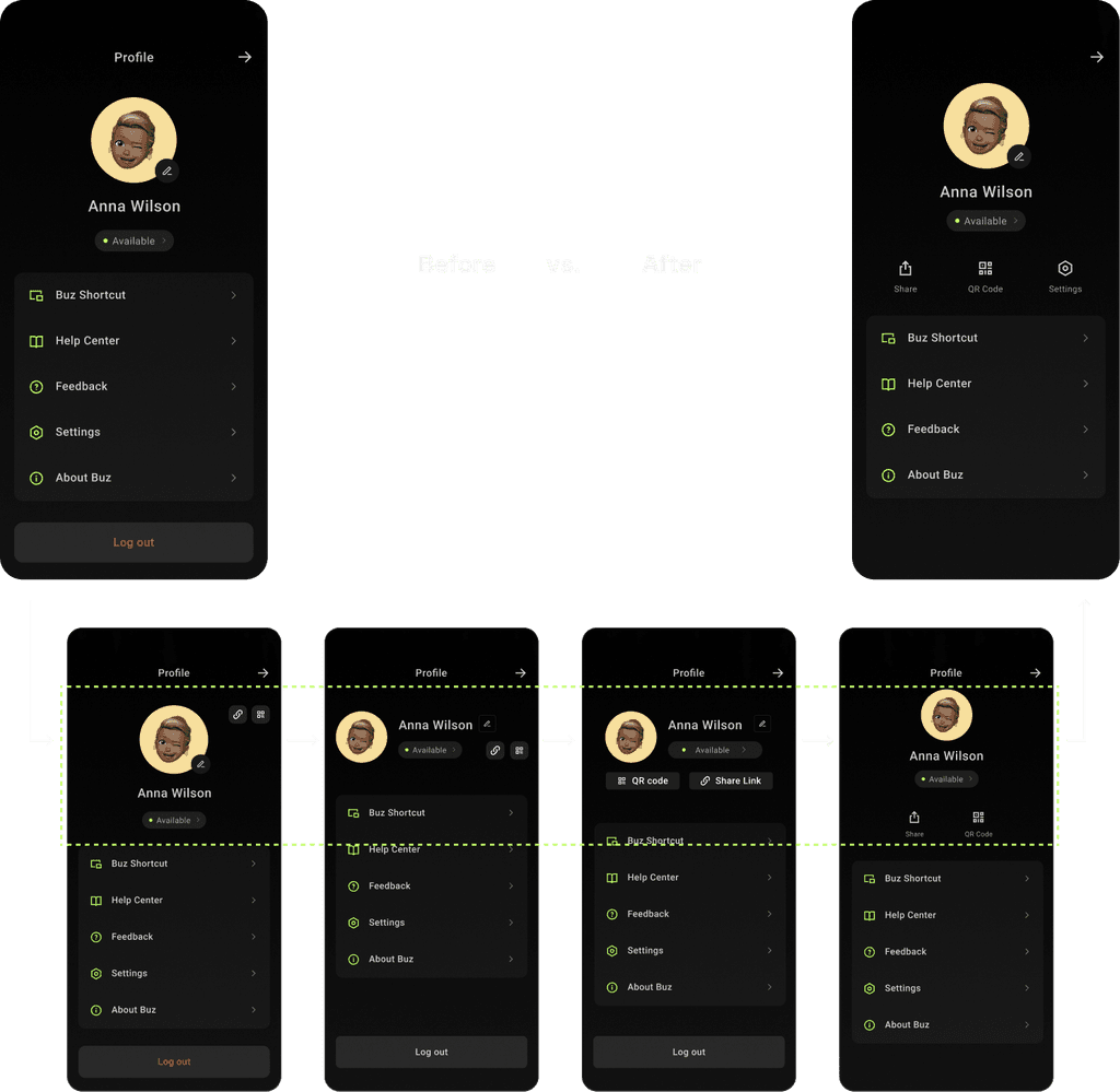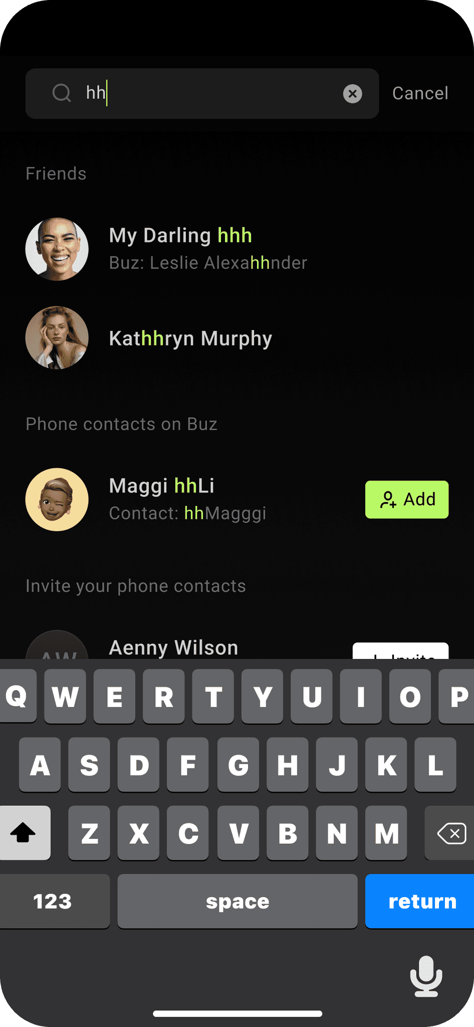 Implementing a search bar universal within Buz, and making invitation links and QR code accessible at various points ensured that users could effortlessly find and add friends under many user scenarios. Sometimes, intuitive experiences require redundancy.