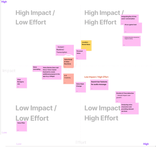 Before designing Voicemoji, I organized and facilitated the internal Idea Discovery Workshop for the design team. For the feature prioritization, we recognized that the Voicemoji feature had the potential to have high impact while requiring low effort. This prioritized Voicemoji as a key feature to develop.